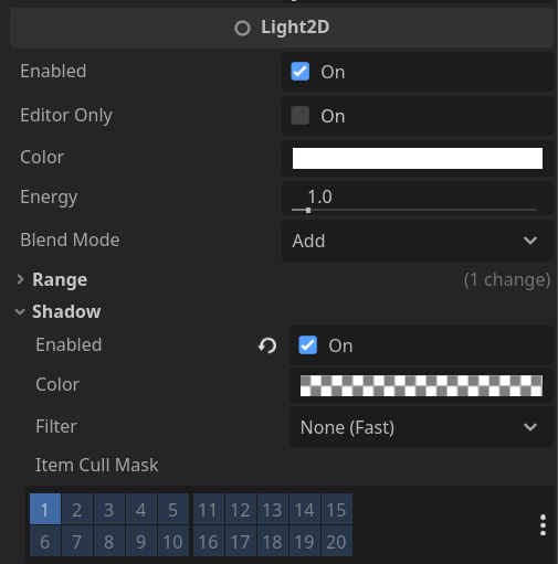 类似地,CanvasItem中的Light Mask属性用来设置物体属于哪个/哪些光照图层,在2D光源Light2D中的Range组下有一个Item Cull Mask与之对应,用来控制这个光源在哪些图层上计算光照。